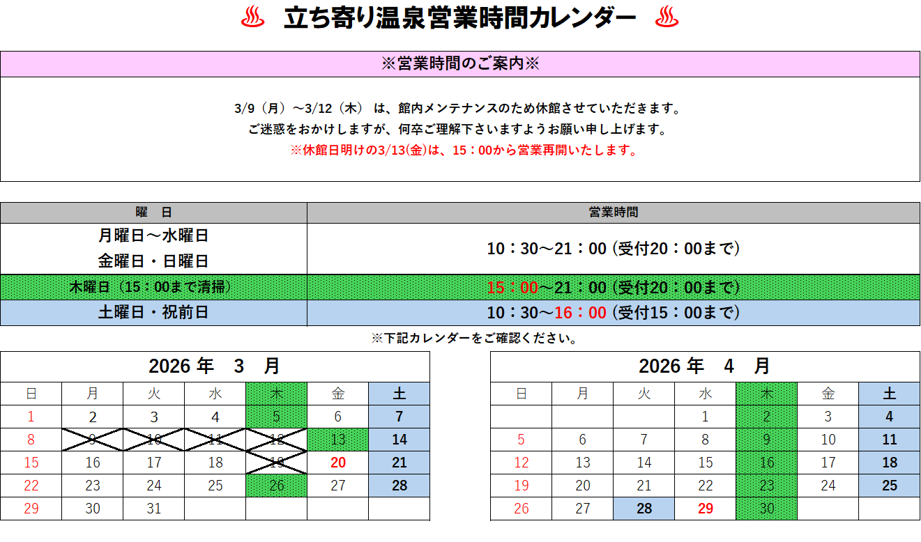 【2026年3月~4月】立ち寄り温泉営業カレンダーのご案内